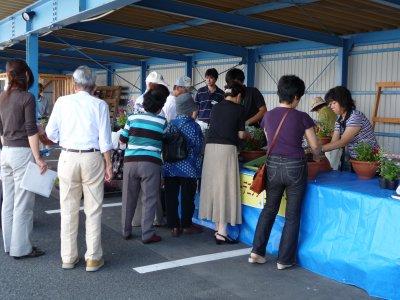 人気上々の「寄せ植え」作り会場にて