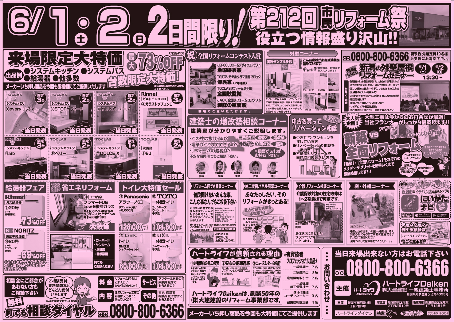 姥ヶ山インター降りてすぐ!『TOCLAS(トクラス)』にて開催。第212回を迎え、地元・新潟市の皆様にご愛顧いただいている『リフォーム相談会』です。イベントならではの大特価品や展示商品も揃えております!