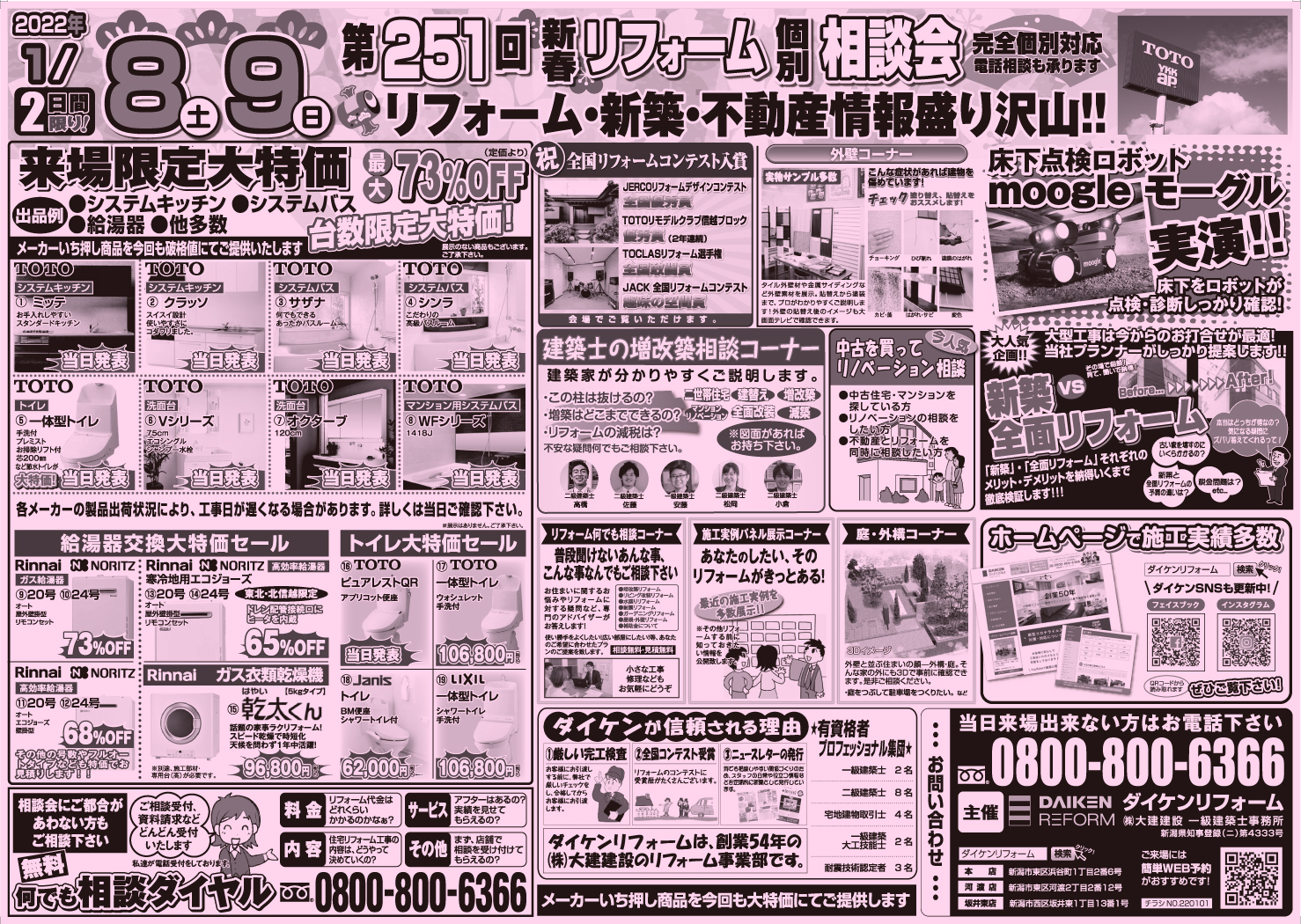 弁天インター降りてすぐ!『TOTO』にて開催。第251回を迎え、地元・新潟市の皆様にご愛顧いただいている『リフォーム相談会』です。イベントならではの大特価品や展示商品も揃えております!