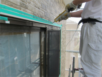 シーリング材を隅々まで盛り上げるように充てん!充てんが不足すると密着不良の原因となります。もちろん、水分やゴミがあっても密着不良の原因となりますから、事前の掃除は必須!!雨の日にやるのもNGです!